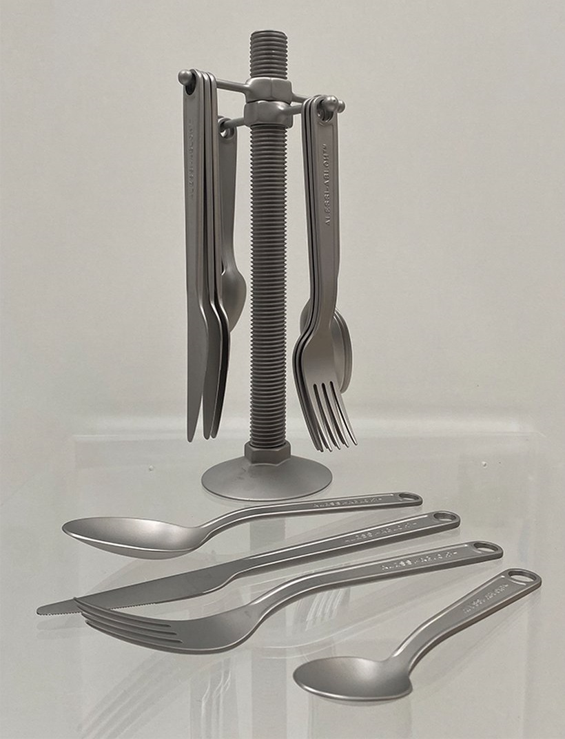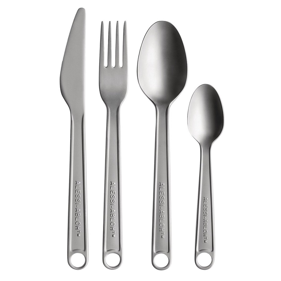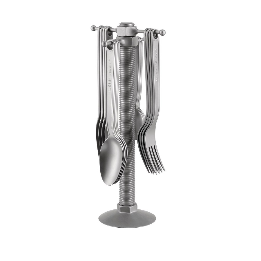 The cutlery set from Alessi ‘s Conversational Objects series consists of perfectly balanced and easy-to-use pieces. Each piece has a loop for hanging on the screw-shaped cutlery stand, keeping your cutlery organized and readily accessible. Set includes 4 each of spoons, forks, knives and teaspoons with a stand made of 18/8 stainless steel. The stand is perfect for those who prefer more order and clarity in the kitchen. The set is dishwasher safe.
