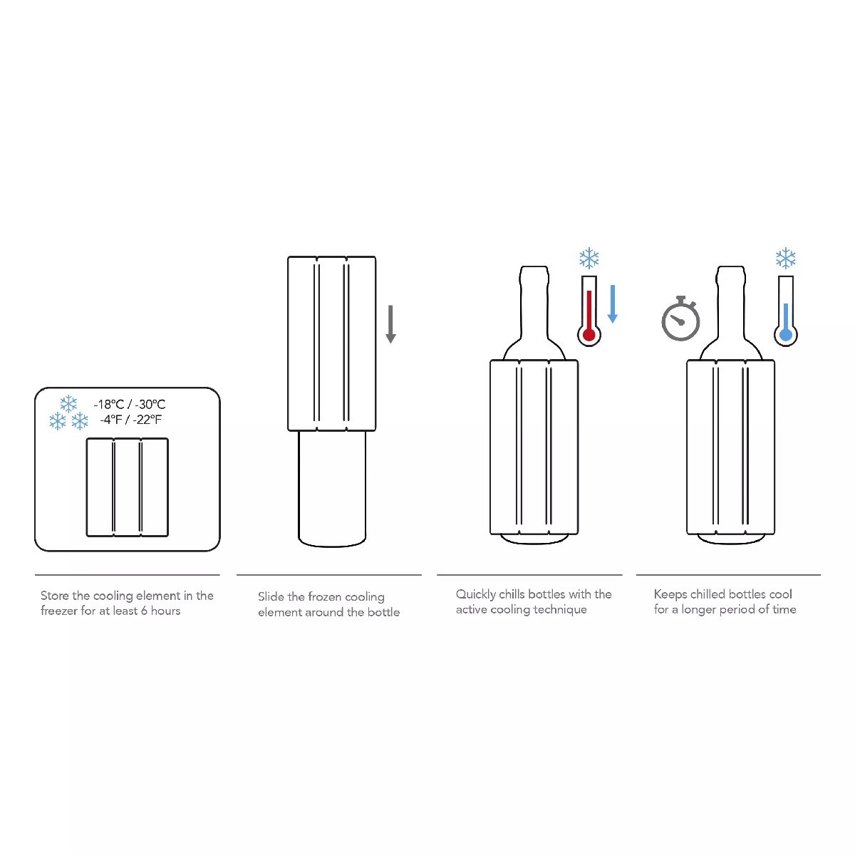 The Vacu Vin Active Cooler Wine Silver actively chills your favourite bottle of wine and keeps it cool and refreshing. The insulated bottle cooler sleeve keeps the bottle at its ideal serving temperature until the last sip. For optimal use, keep the reusable sleeve in the freezer for at least 6 hours.