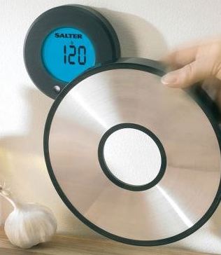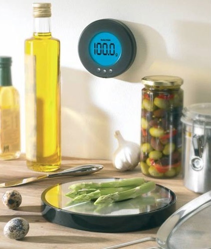 Wall-mounted digital clock with a removable food scale that can be separately placed on a countertop or table. The scale is controlled entirely by a touchscreen, and when not in use you can slide it over the clock and lock it into place. When removed and used to weigh food or other items, it uses an infrared signal to transmit its measurements in either metric or imperial readings to the easy-to-read backlit display mounted to the wall. When not in use as a scale, the display provides the time and room temperature.