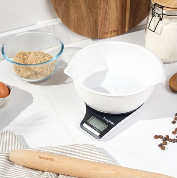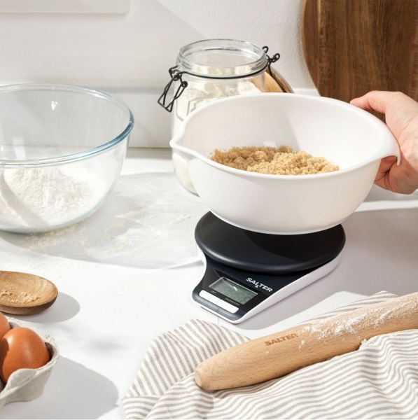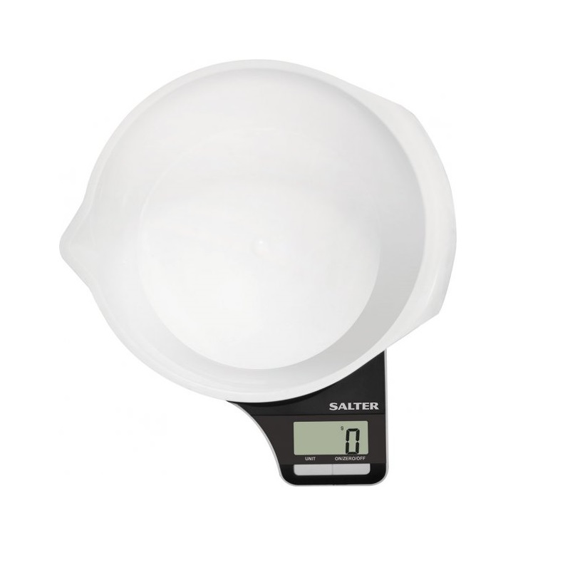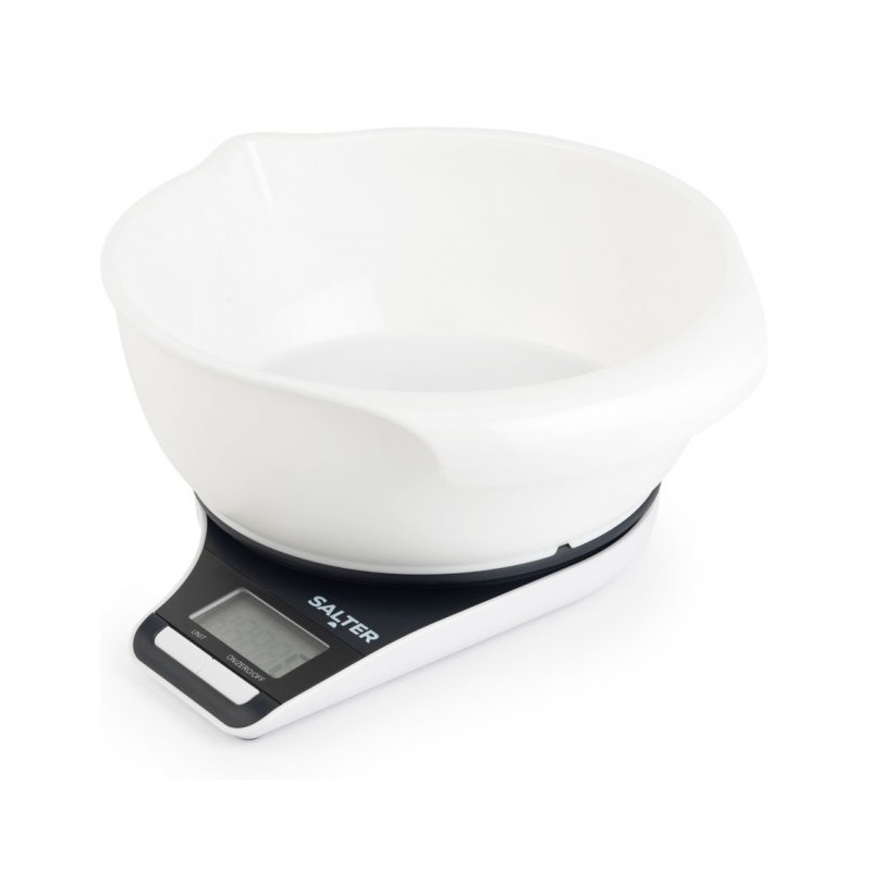 Weigh ingredients, wet or dry, in this Electronic Jug Scale from Salter, perfect for baking tasty treats. The scale comes with a 1.25 Lt jug with an easy pour lip, which is dishwasher safe, to easily pour your liquids and mixtures and then quickly wash after use. Add & weigh multiple ingredients into the same bowl, without the need of multiple bowls and saving time on washing up, simply press zero. Has an Aquatronic function is included for measuring liquids in ml or fl. oz. Has an easy to read LCD display.