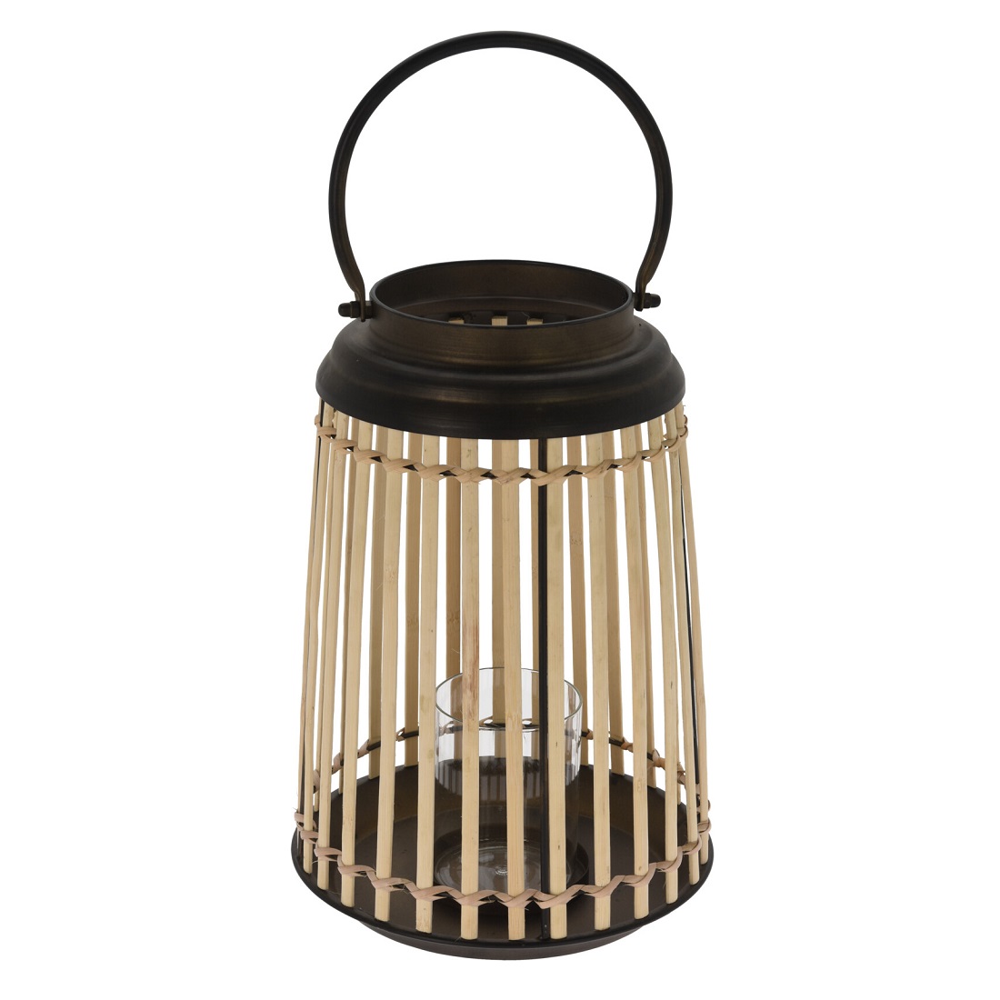 This decorative lantern is perfect for indoor and outdoor use. With its exterior made of bamboo, it creates a relaxed atmosphere. The inner glass is removable and serves as a candle holder up to a maximum of Ø 6cm.