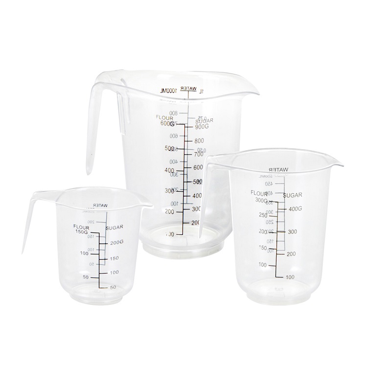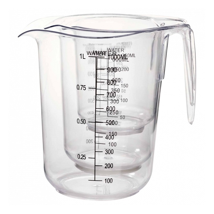 This set of three acrylic plastic measuring jugs displays grams and millilitre measurements on the exterior, ideal for following any recipe style. The three sizes of measuring cups can be stacked up inside each other to save storage space in your kitchen.