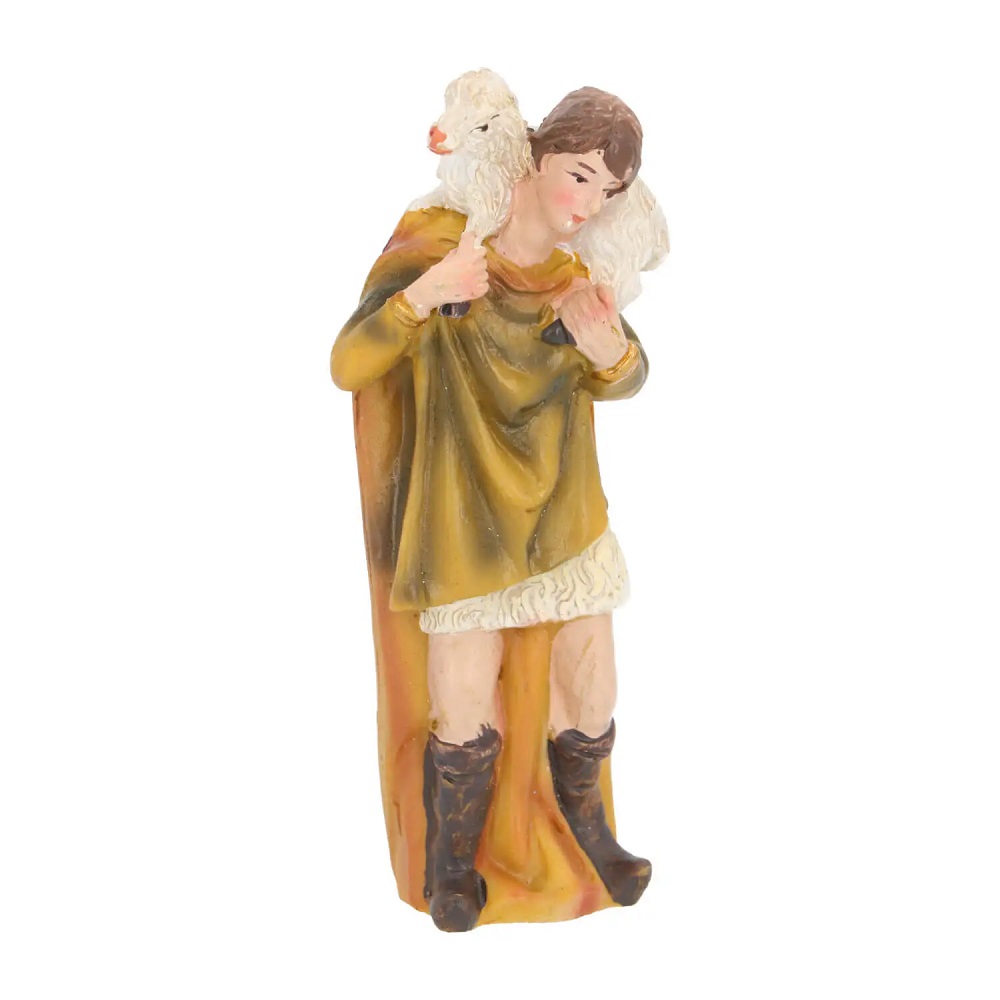 Colourful, painted nativity figures including baby Jesus, Mary and Joseph, the three wise men, a shepherd as well as an ox and donkey.