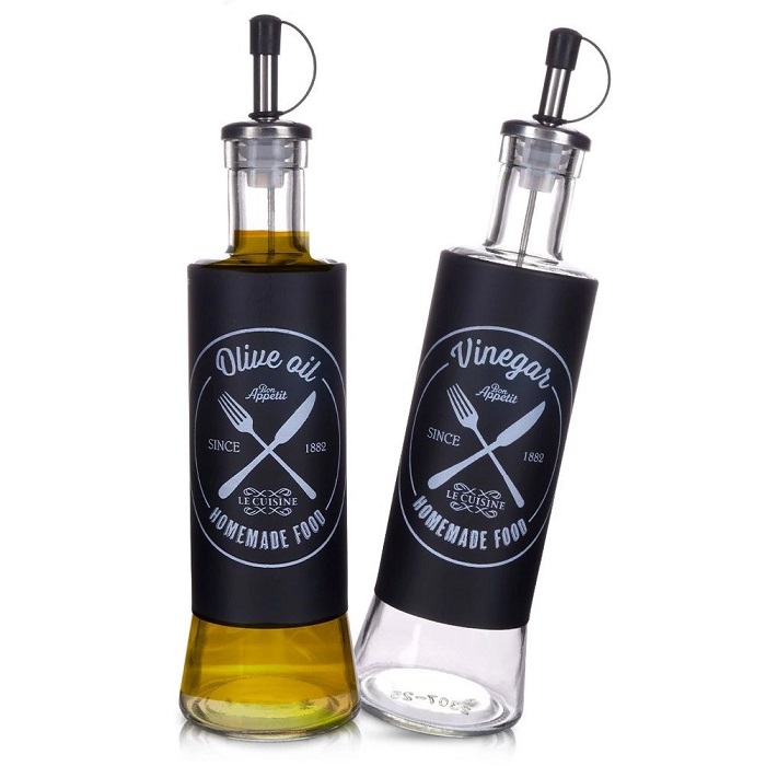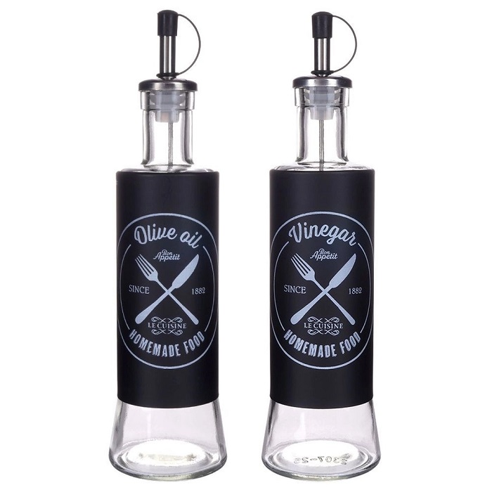The bottle is made of high quality glass with a metal casing. The white print precisely indicates the purpose, making it easier to distinguish oil from vinegar. The bottles are equipped with dispensers with stoppers, which slow down the flow of oil and vinegar. This allows for precise dispensing and even spreading on the dish. The stoppers protect the contents from spilling and keep them fresh for longer. The oil and vinegar bottles are perfect for both home use and in the catering industry.