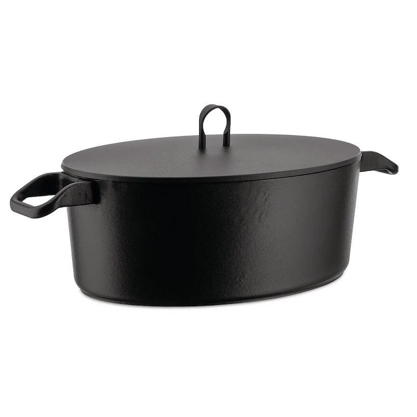 The oval cast iron casserole of La Cintura di Orione series is dedicated to gourmets who are looking for the quality of professional tools at home. This cast iron casserole is suitable for controlled cooking at high temperature, such as braising and stewing. It is made of high-density cast iron to ensure heat stabilization.