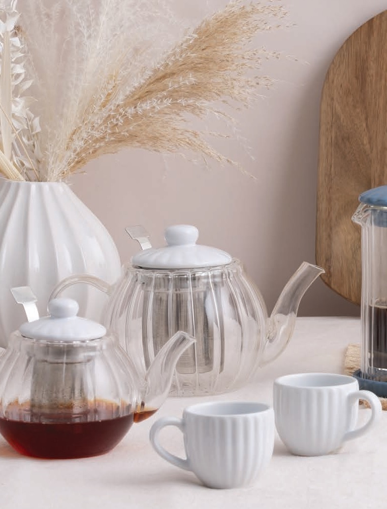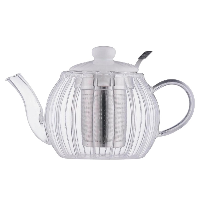 Enjoy a refined tea experience with this fluted embossed glass teapot featuring a white ceramic lid and stainless steel infuser. Crafted from heat-resistant glass, it allows you to watch your tea brew to perfection while adding a touch of elegance to your kitchen or dining table. Ideal for both loose-leaf and bagged teas, this teapot combines functionality with timeless style, making it perfect for any tea lover.