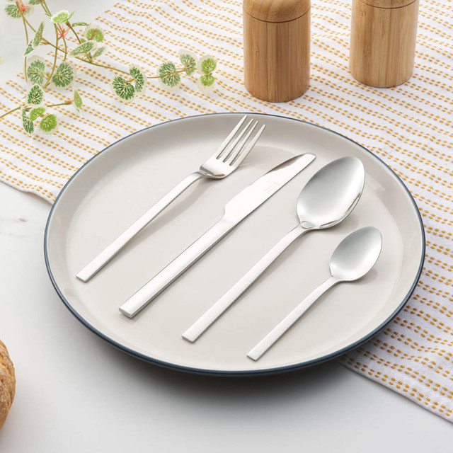 The Russell Hobbs Vermont 24-Piece Cutlery Set is designed to enhance your dining experience. This set is perfect for hosting dinner parties or everyday family meals with its service for 6 people. Crafted with a simple yet elegant design, it seamlessly complements any table setting. The classic mirror polished finish adds a touch of sophistication to every mealtime. Not only stylish but practical too, the set is dishwasher safe, making clean-up a breeze. Set consists of 6 table forks, 6 table knives, 6 table spoons and 6 dessert spoons.