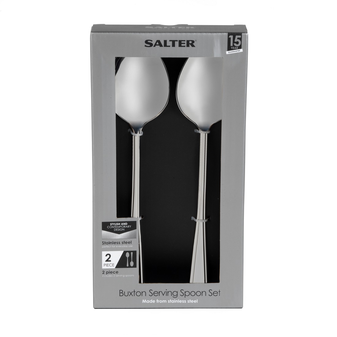 Serve in style with these Salter Buxton large serving spoons! This 2-piece set is designed to be lightweight and comfortable to hold. Each spoon boasts a stunning mirror polish finish and is dishwasher safe for an easy clean up! This flatware set is a welcome addition to any dinner party and is suitable for serving any type of dish including buffets, salads and pasta!