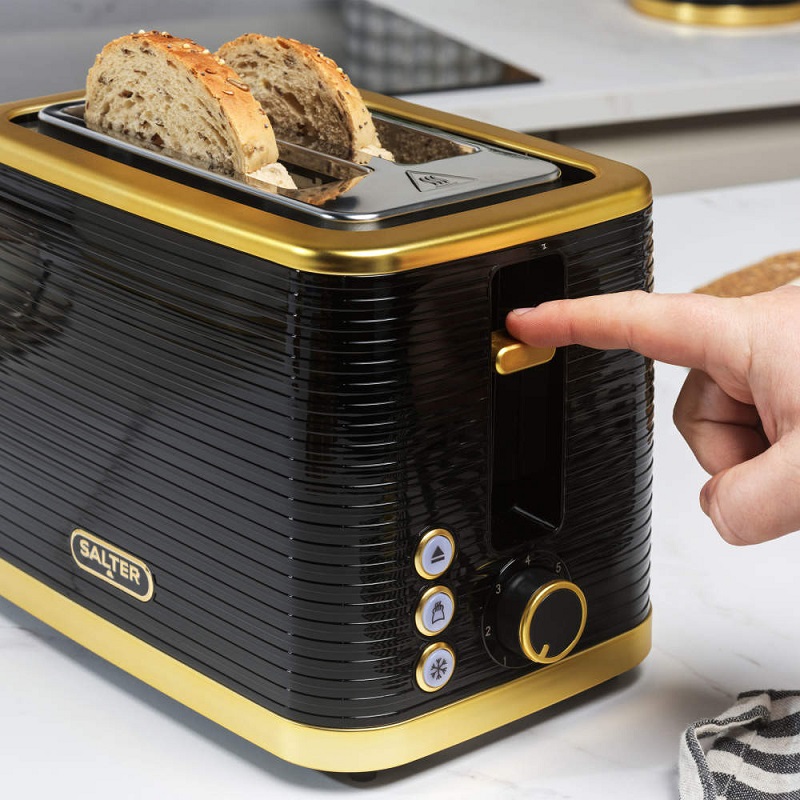 Start your morning off the right way with a perfect slice of toast from this 2-Slice Texture Toaster from our Salter Palermo collection! With 7 levels of variable browning which allow you to tailor your toast to just how you like it, removable crumb tray and wide toasting slots, you can make perfect toast, bagels and crumpets every time with little mess! Forgot to defrost your bread? We have you covered with the convenient defrost, reheat and cancel functions. In a sleek black and gold textured finish which looks great in any kitchen décor.