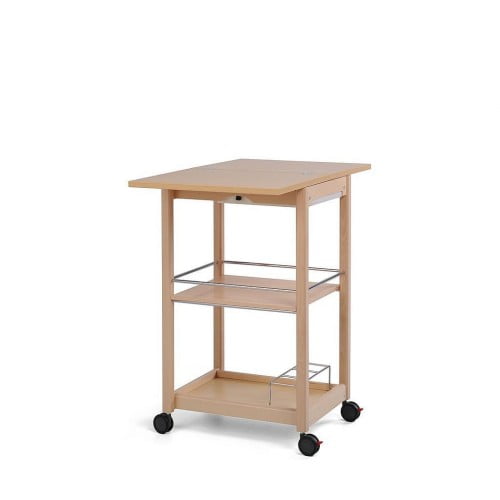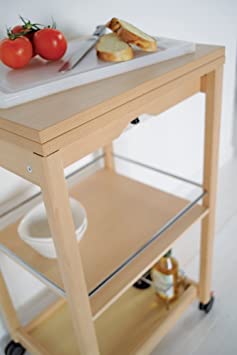 The Servi-tu wooden kitchen trolley turns into a table for two people. Servi-tu has three convenient shelves which help keep your kitchen tidy and functional. The upper worktop doubles up as a table and is equipped with a removable chopping board. The middle shelf can accommodate kitchen utensils while, the lower shelf is complete with a metal rack for condiments and bottles. It features a sturdy and durable frame in solid wood and scratch-proof rubber castors with braking system, to make it easy to move around.