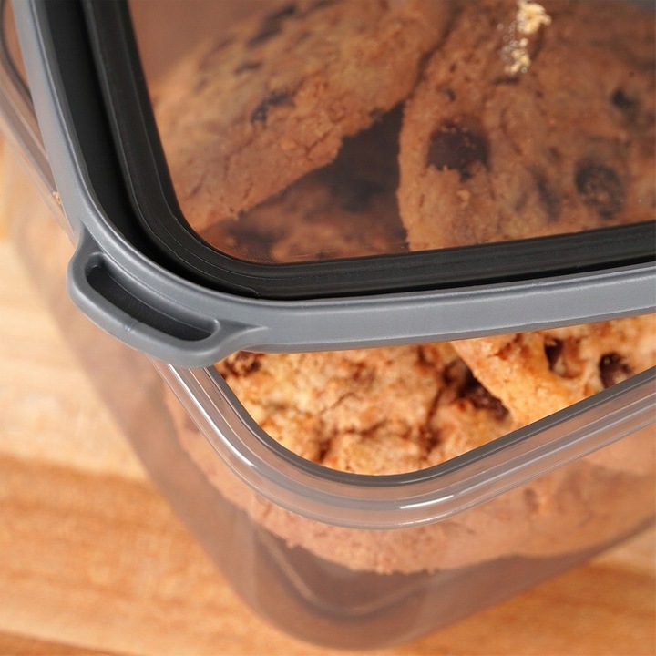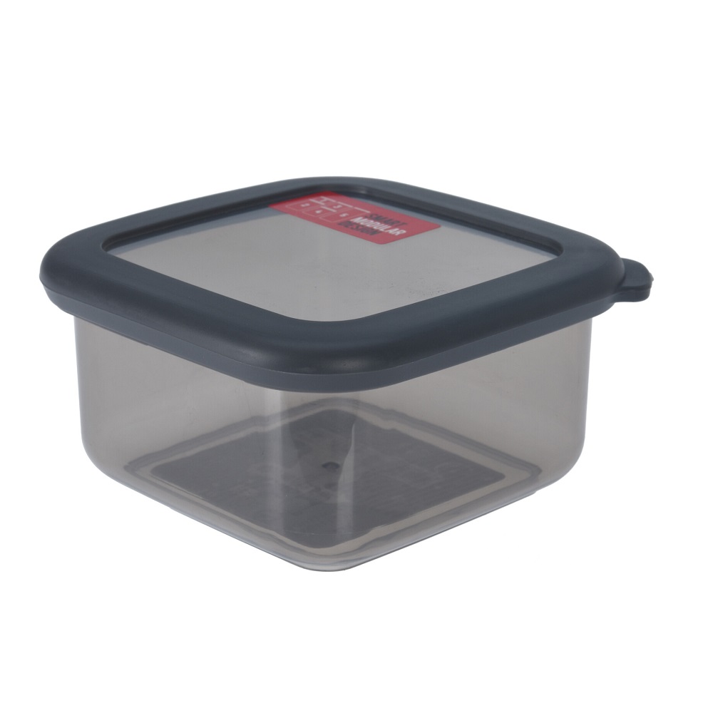 Kitchen container with lid for storing snacks or left overs. Made of the high quality, durable plastic in a transparent, dark grey colour, safe for food and also dishwasher safe. The container has a well-fitted lid that ensures tightness during storage and transport of food products. The transparency of the container will make it easy to check its contents. Additionally, the container is stackable saving space in the cabinet.