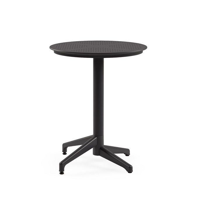 The Moon Table, with its elegant silhouette and minimalist design, stands out with its perforated surface. The extruded aluminum tube opens and separates to form four crossed legs, making the Moon Table easily stackable. It is suitable for both indoor and outdoor use. The table is also UV resistant thanks to the fiberglass reinforced polypropylene material. The metal surfaces are specially treated, glossy, and coated with solvent-free powder paint. Also features non-slip feet.