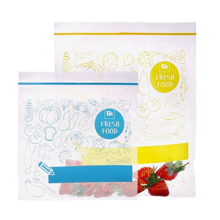Bags with practical zip closure guaranteeing tight closure of the food contents. They are used to store food and other loose products. They can be used to store small beads, buttons or be used for cosmetics while traveling by plane. Suitable for the fridge and freezer and they are reusable.