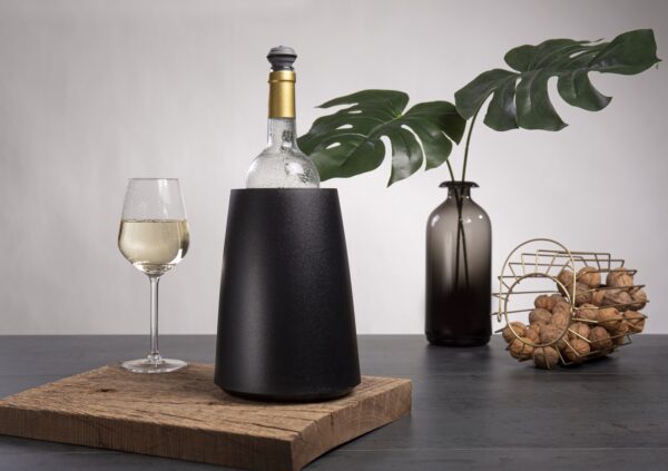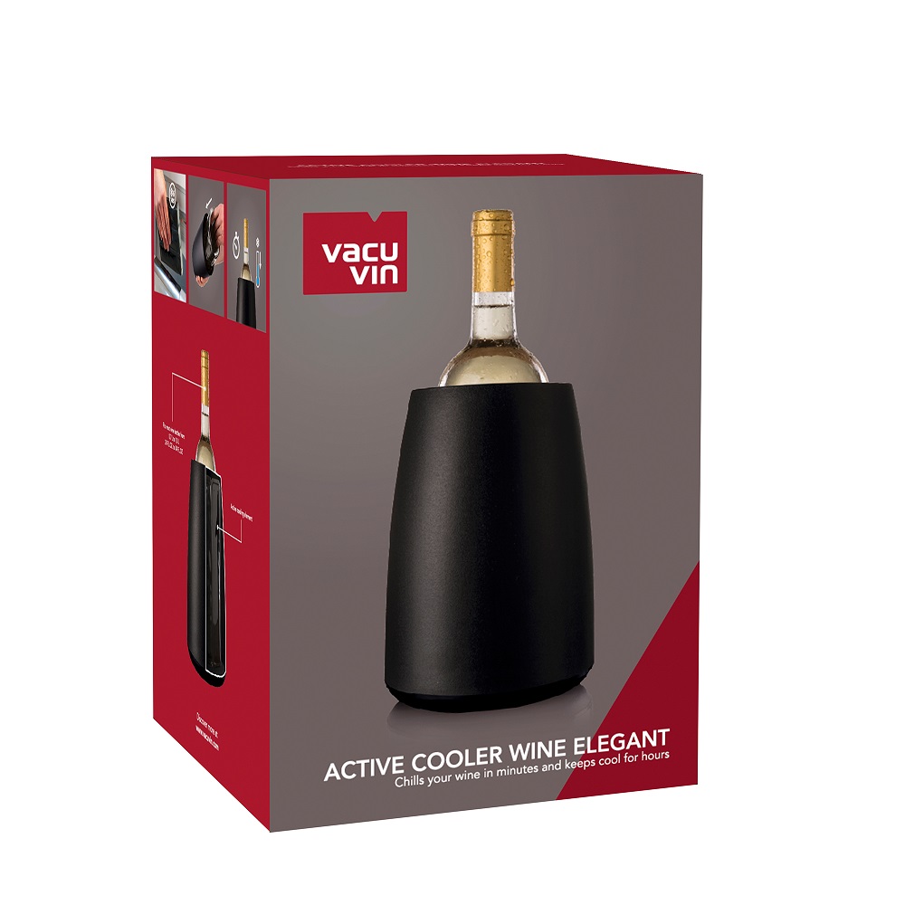 The Vacu Vin Active Cooler Wine Elegant Black actively chills your favourite bottle of wine and keeps it cool and refreshing until the last sip. The elegant case contains the active cooling element that keeps the bottle at its ideal serving temperature for up to 90 minutes. Keep the cooling element in the freezer for at least 6 hours for optimal use.