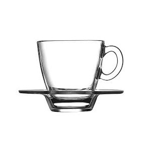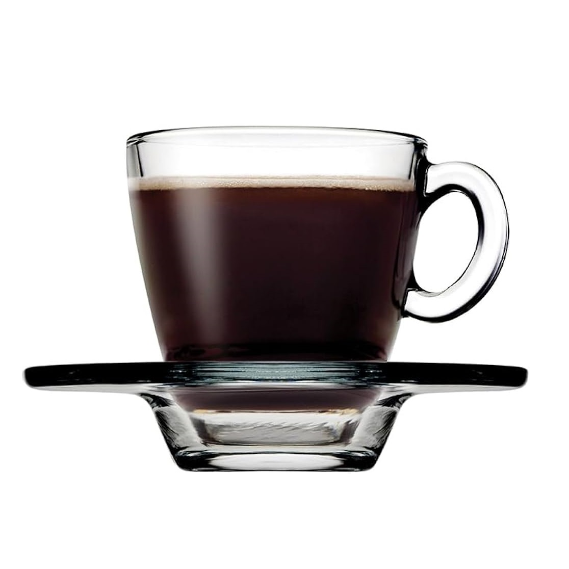 A stylish set of espresso cups and saucers which are heat resistant, dishwasher safe and also microwave safe. The cup and saucer are made of tempered glass and are suitable for any café, bar or in your home.