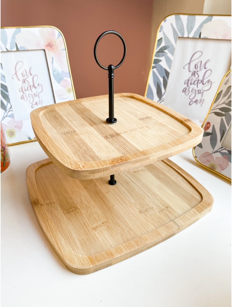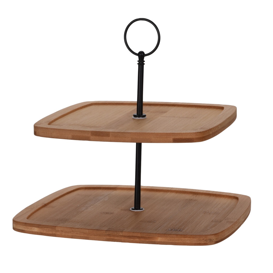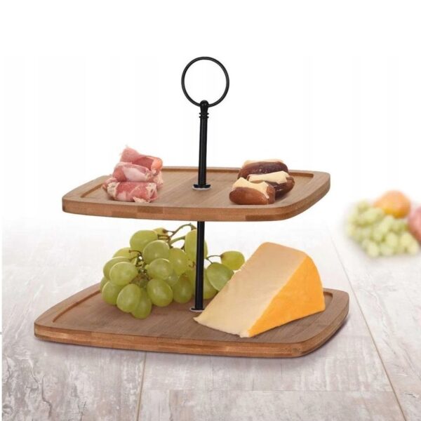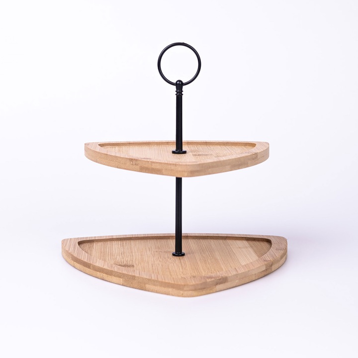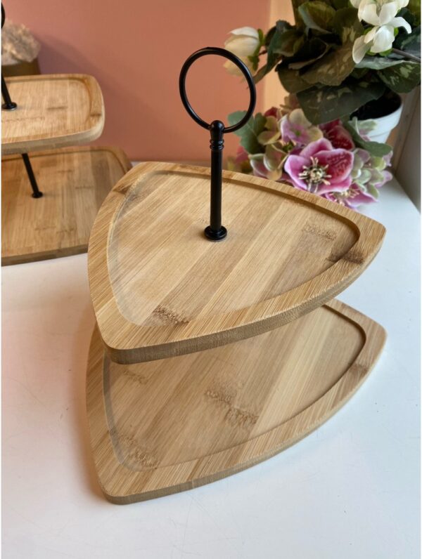 Two-tier cake stand made of high-quality bamboo with a metal stand. It is practical and aesthetically pleasing on any table setting. It is light but stable and durable. Two different shapes are available – triangular and square. Each of them has its own unique features that add charm to any table arrangement.