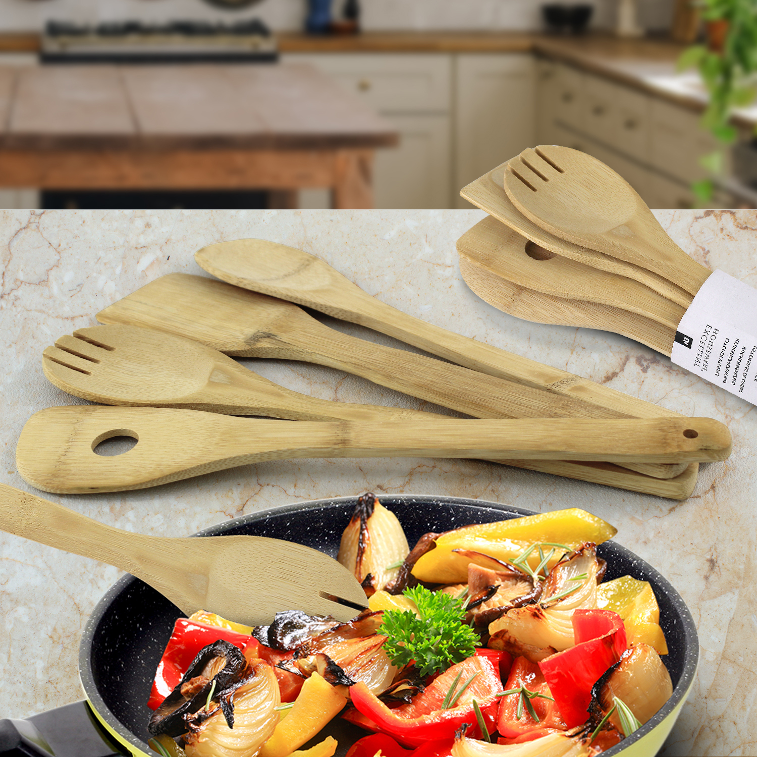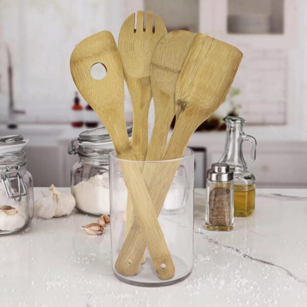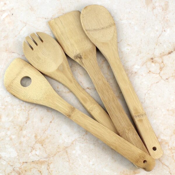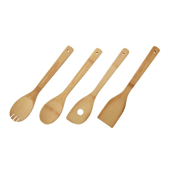 Set of 4 basic bamboo kitchen utensils for your culinary day-to-day cooking. Suitable for washing in the dishwasher. All of the pieces have a hole perfect for hanging them in your kitchen.