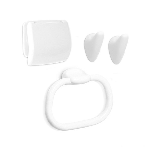 Set includes: 2 Hooks, 1 Flat Toilet Paper Holder & 1 Towel Ring