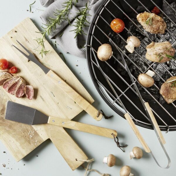 This 3-piece barbecue utensils set is a perfect addition to your summer barbecue party. The utensils are easy to hold thanks to the wooden handle and they all come with practical hanging loops. The 3-piece set includes 1 fork, 1 grill tongs and 1 spatula.