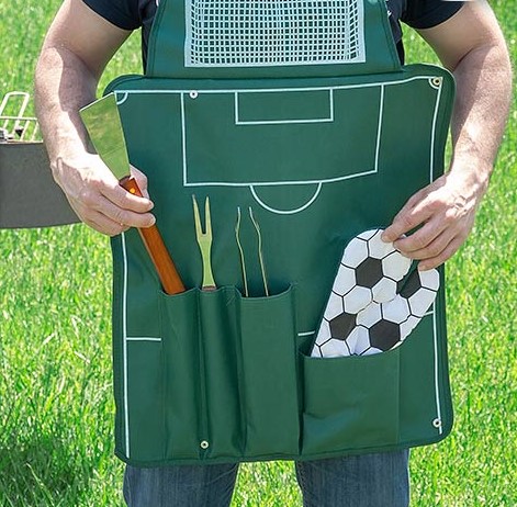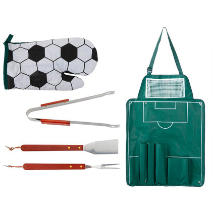 Super nice barbecue gift set in football design. The barbecue set consists of luxury barbecue tongs, fork, spatula, football barbecue glove and apron with football field design and handy storage compartments.