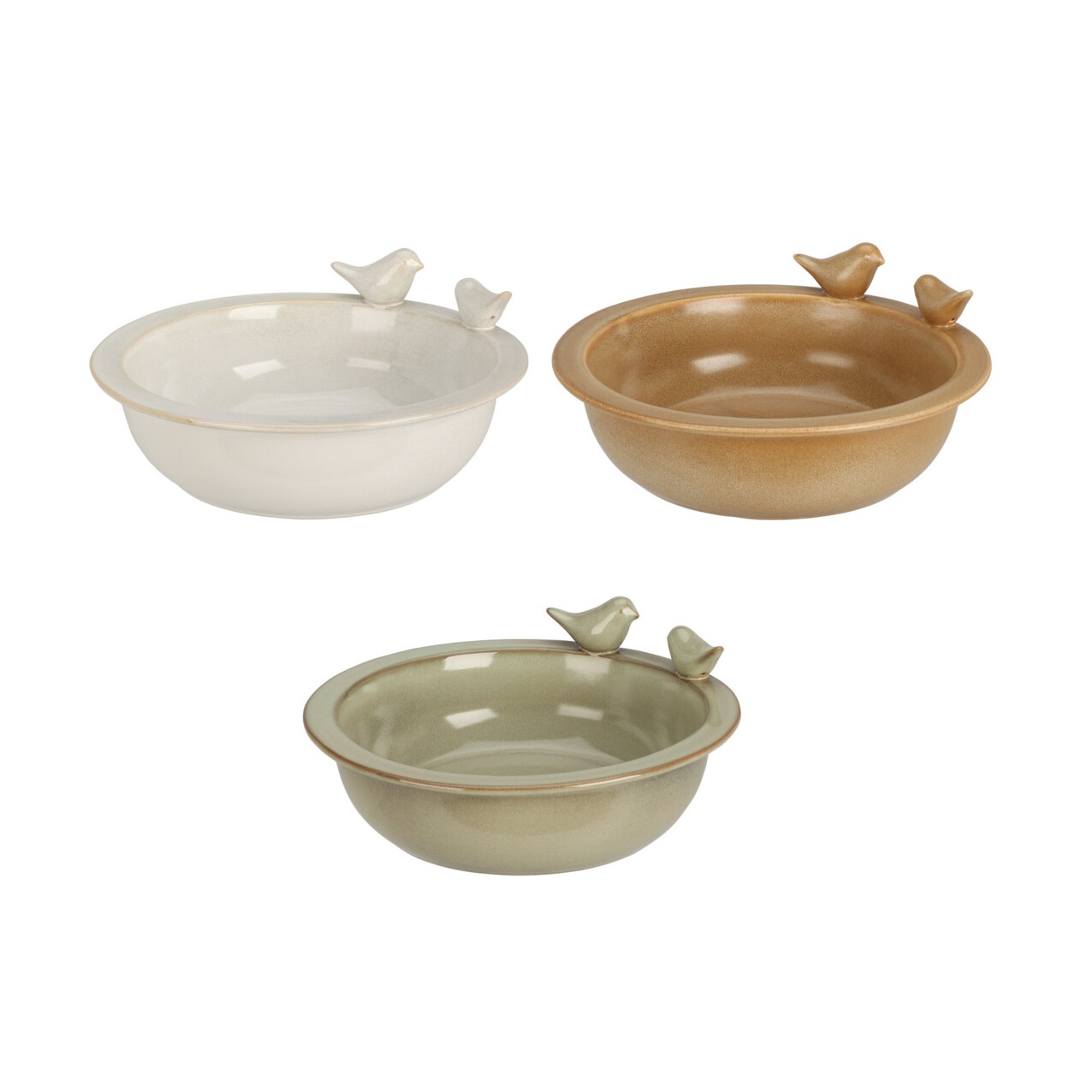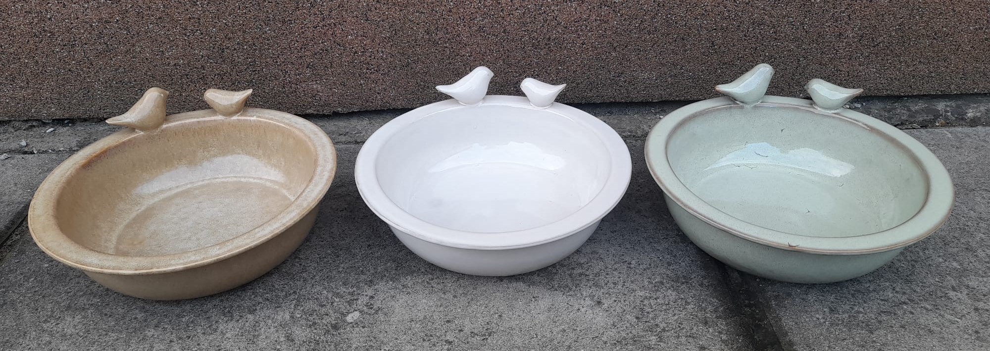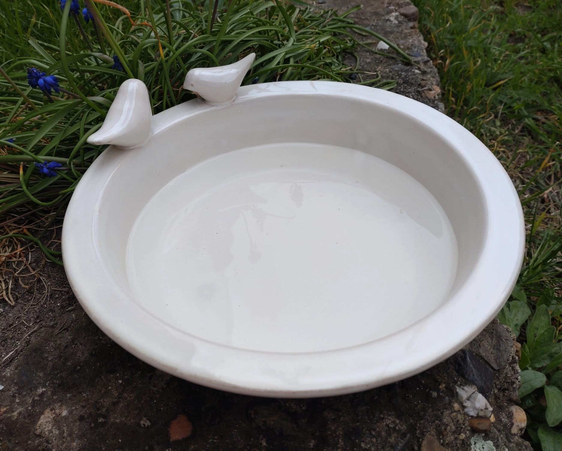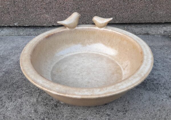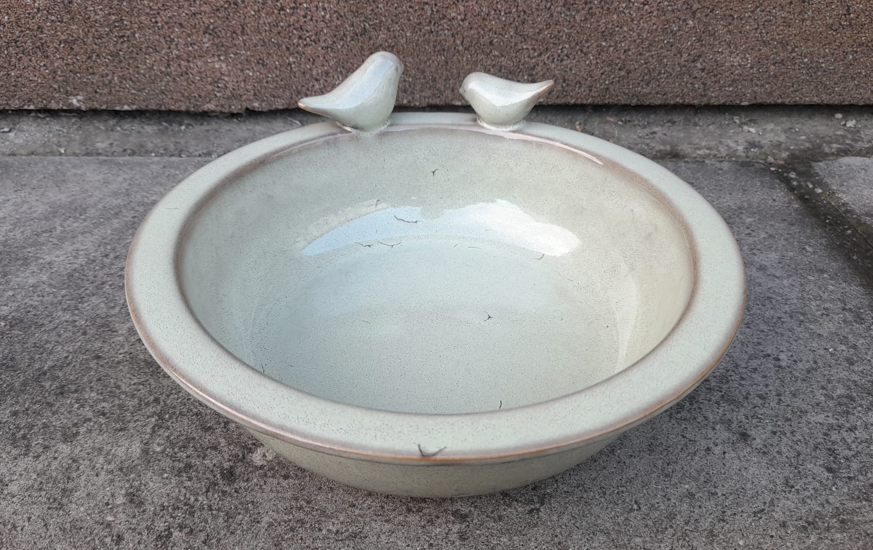 Garden decoration that serves as a waterer, feeder or birdbath, made of glazed porcelain. It features two bird figurines for an added decorative element.