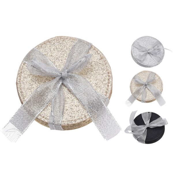 Set of four drinks coasters suitable for the festivities protecting worktops and surfaces from hot and cold drinks. Available in a choice of three colours; gold, black & silver with glittery surface.