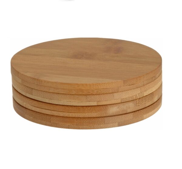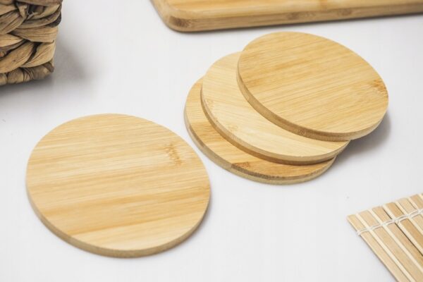 Round bamboo coasters suitable for glasses, bowls or even dishes when placed next to each other. The coasters feature a stylish nature look and made with high-quality, environmentally friendly bamboo.