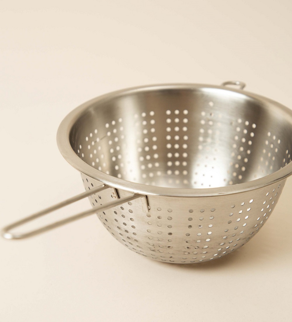 100% stainless steel for a long-lasting use. It is ideal to wash up salad, blanching, as a soup strainer or pasta strainer. The colander has a perforated body and features a long handle so it’s safe to handle as well as little feet for a stable hold. Dishwasher safe.