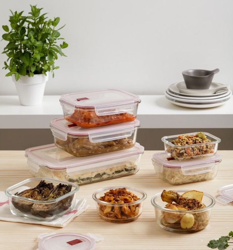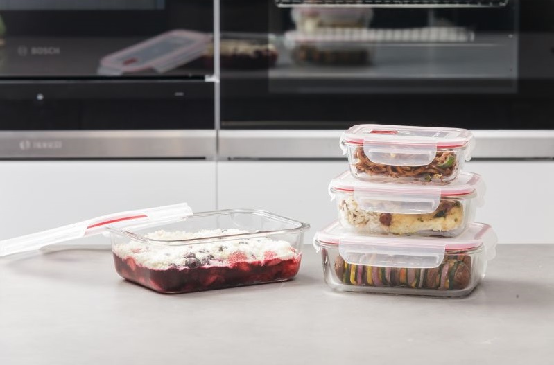 The Cook & Eat range is a range of food boxes made of borosilicate glass that allows you to cool, store and heat food in the same bowl. Thanks to their thermal shock resistance they are suitable for use in ovens up to 450oC (without lid), in a microwave for up to 100oC (with lid) and in a freezer up to -40oC (with lid). The silicone valve allows for the food to heat or cool much faster.