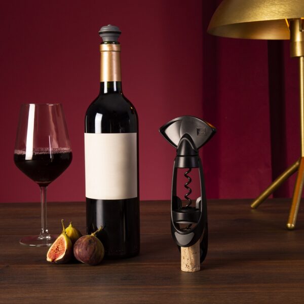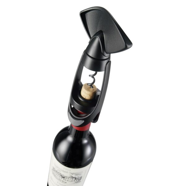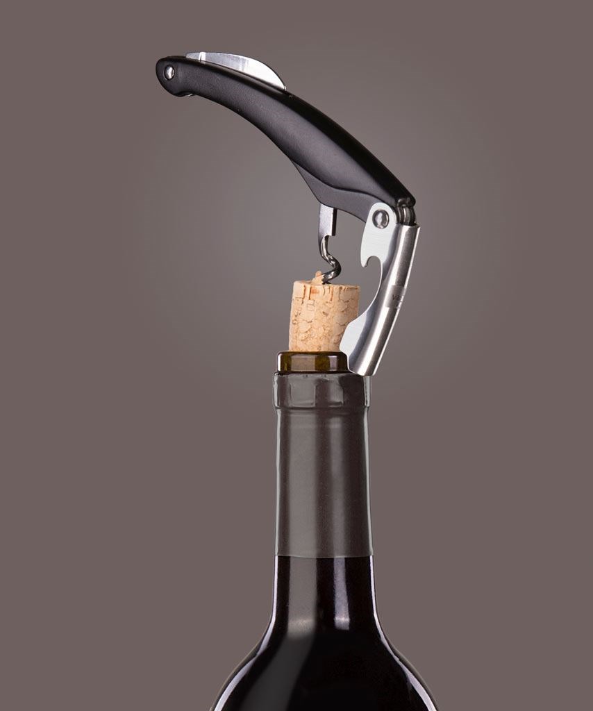 After removing the foil from your bottle, place the corkscrew on top of the wine bottle. While maintaining a firm grip, press the sides against the bottle. The rubber strips make sure the bottle opener is secure and won’t turn while you drive the corkscrew into the cork. When the cork is extracted, remove the corkscrew from the bottle. You are ready to serve.