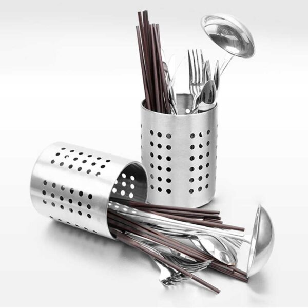 Made of high quality stainless steel with a gloss finish, resistant to corrosion. It is ideal for storing medium sized kitchen utensils and cutlery which is made accessible on the kitchen counter. The cut-out design all around allows for water to flow through when using this utensil holder as a drying rack.