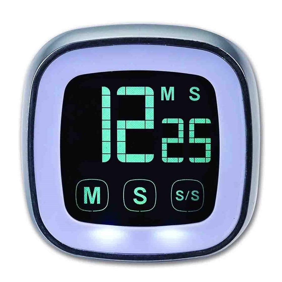 A Digital timer with a loud alarm system and stand for support. Batteries included