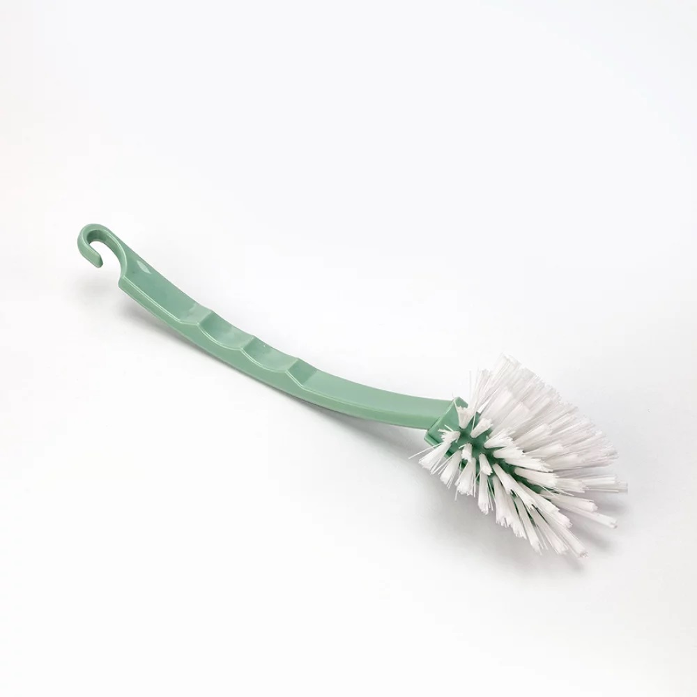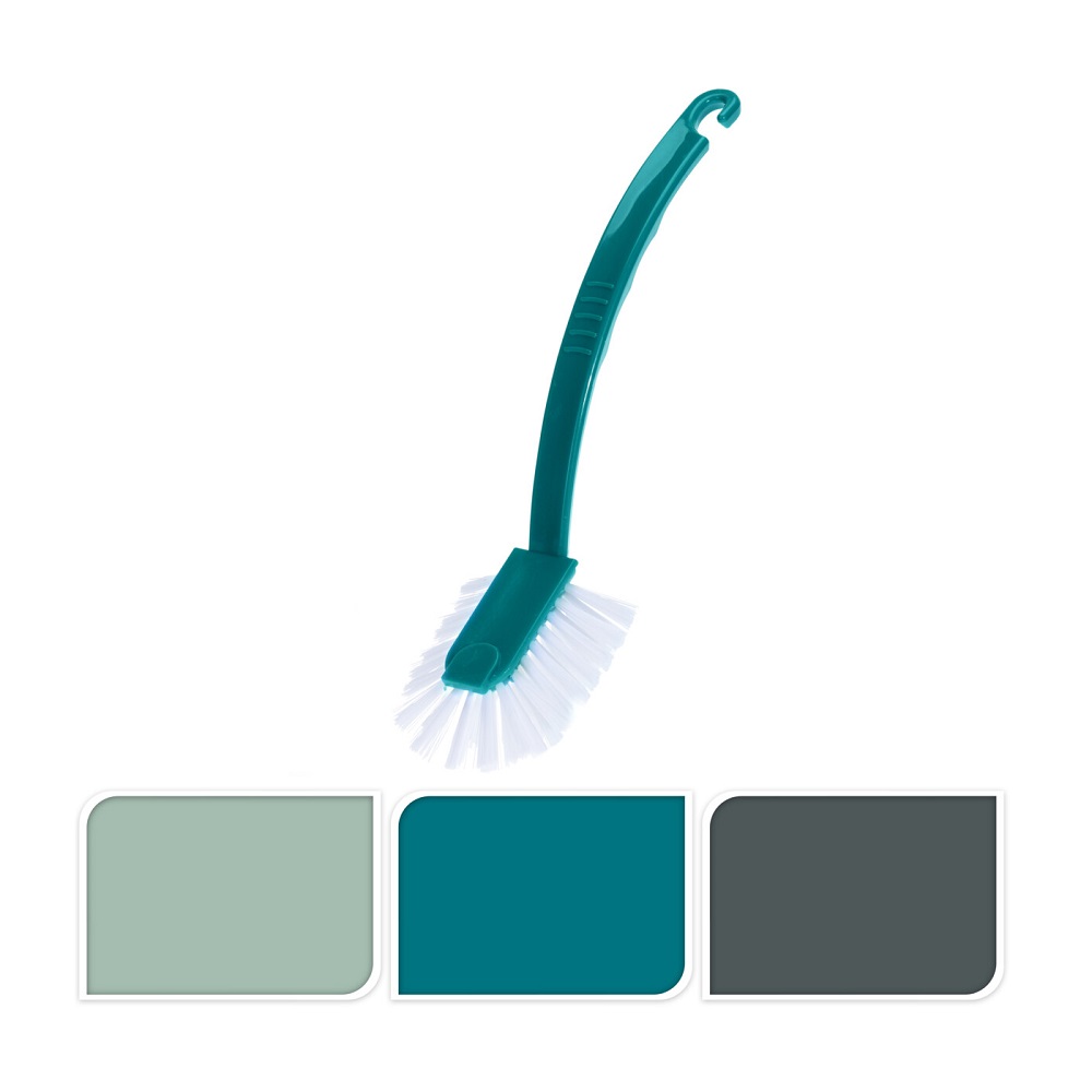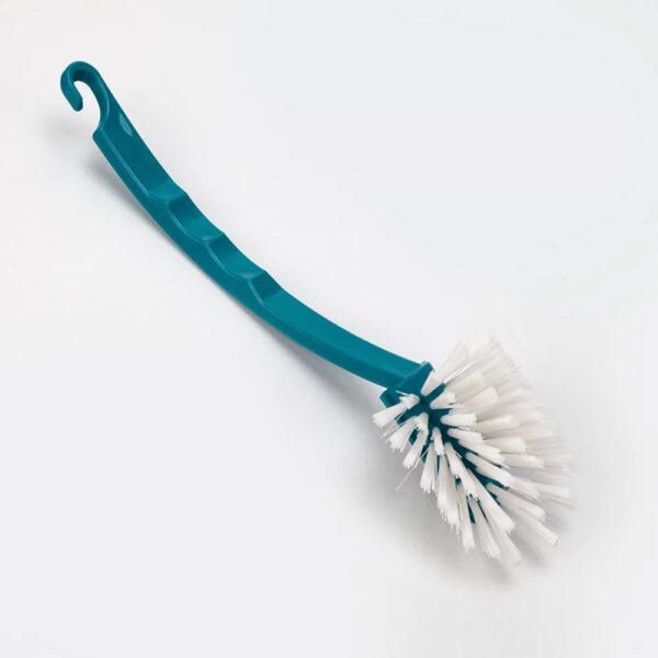 This dishwashing brush provides powerful cleaning, equipped with a scraping edge and a hanging hook.