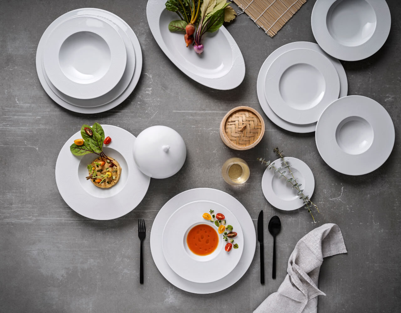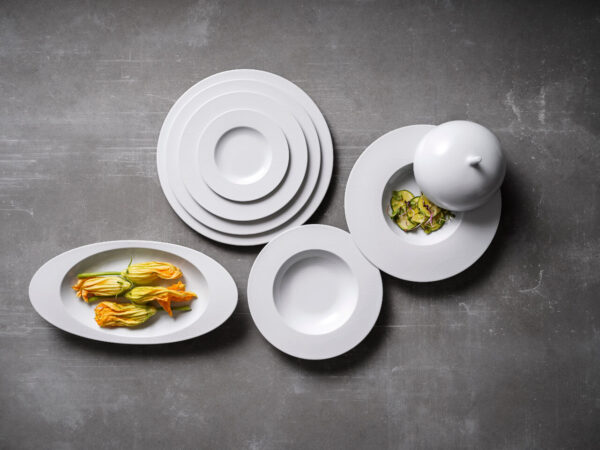 The softness of the relief in this collection is inspired by Zen gardens and the sense of balance that they convey to us. The concentric circles of the Ecos collection, echo a purified and fascinating oriental imagery that invites us to discover a whole world that remains to be explored, called fine dining.