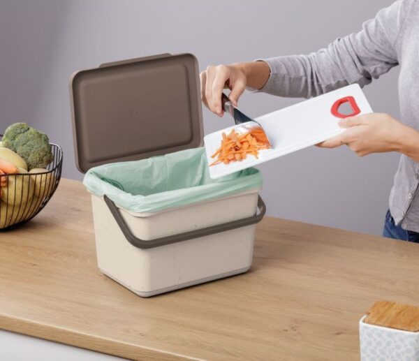 The Ecohome organic waste container made of 100% recycled polypropylene plastic, is perfect for recycling the organic waste that is generated in any room of our house. Its small size makes it ideal to be stored anywhere. Simple and functional design, it has a folding lid and a handle to be able to transport it comfortably. In addition, it has several side slots to be able to adapt bags of different capacities in it.