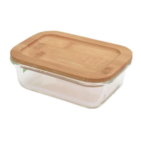 Kitchen container made of high-temperature borosilicate glass with wooden lid and silicone gasket so it does not leak when carrying. The borosilicate container is resistant to high temperatures, which allows you to heat food directly in the container. The glass does not change colour and does not absorb the odours of stored food. The container can be used as a form for baking in the oven or for serving directly to the table. Glass resistant to temperatures from -20°C to 300°C, suitable for storing in a refrigerator or freezer, suitable for the oven and heating in a microwave and washing in the dishwasher.