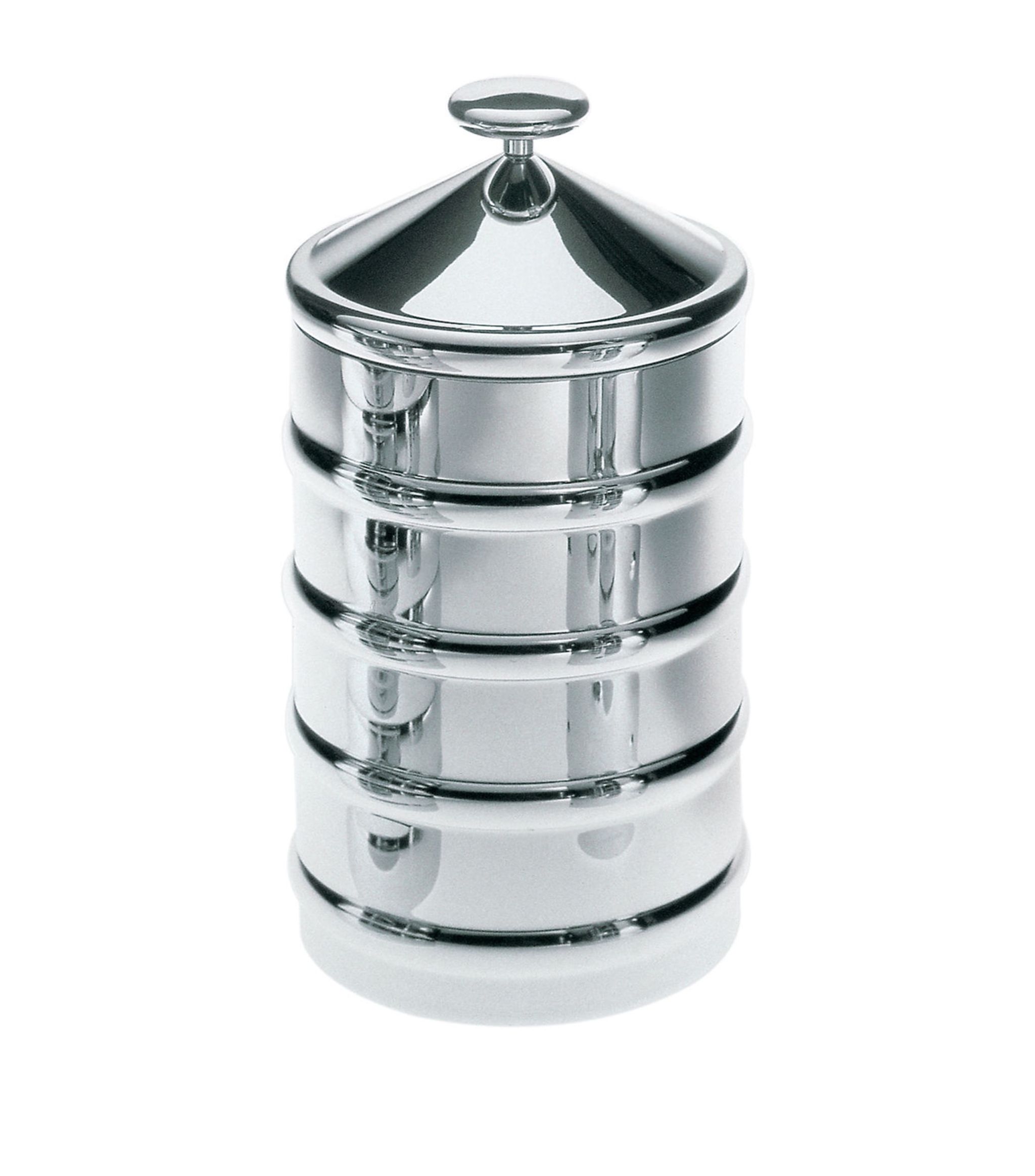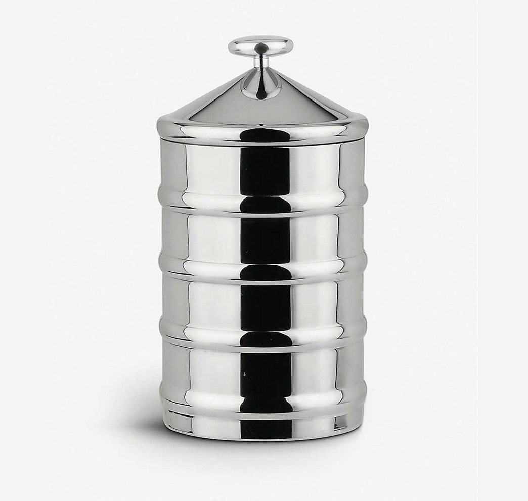This Alessi Kalisto Kitchen Jar features a wide stripe design. The Kalisto kitchen jar is perfect for tea, coffee, sugar, bath salts or cotton buds and is available in three different styles. Made from mirror polished 18/10 stainless steel with an Aluminium knob, the dimensions of this jar are 20cm in height and 11cm in diameter.