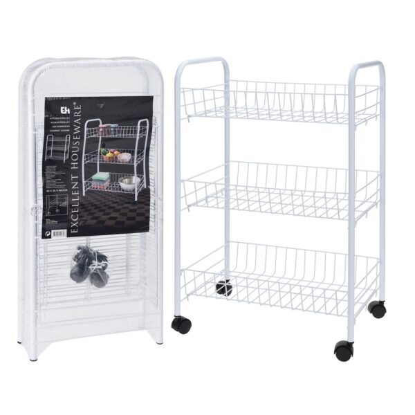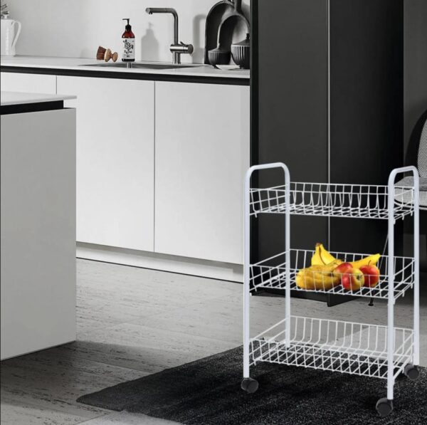 A multifunctional, mobile trolley on wheels to help you organize your space in a wise way. Suitable for bathroom and the kitchen. You can store bathroom accessories, cosmetic bags, towels, kitchen accessories or even use it as a vegetable trolley. It does not take up much space while the wheels make it easier to pull out and transport.