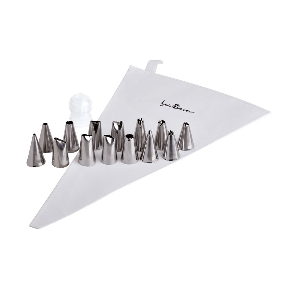 Professional Pastry Icing Set Created by the famed Master Iginio Massari. The pastry bag is made from a special fabric suitable for food contact, with 14 different stainless steel spouts to create various shapes. Useful for decorating dishes and modeling pastes or soft delicacies on trays with speed and precision.