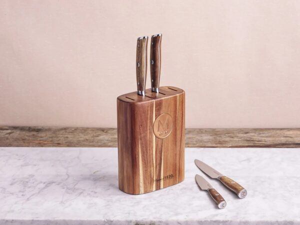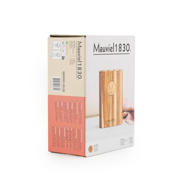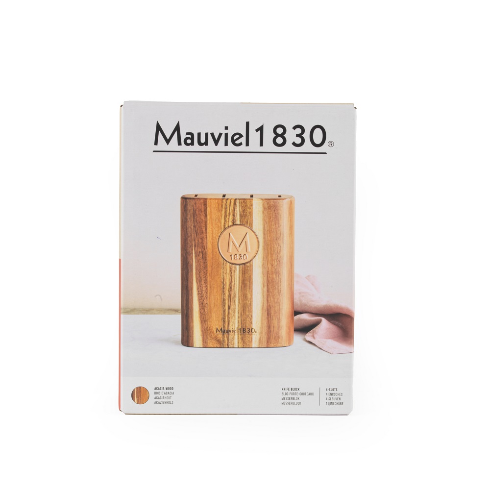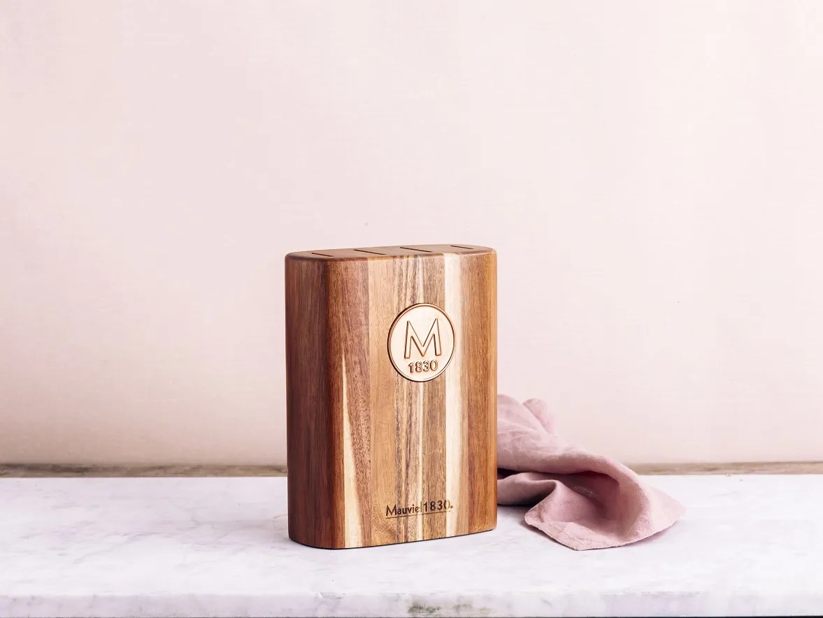 Tidy up your Mauviel 1830 kitchen knife set in this lovely block. The materials are expertly crafted to offer you a quality accessory, in solid acacia wood with its typical natural grains. On the top it is made up of special slots for storing up to 4 knives. It will be simple to remove and insert them, always ready for use on your kitchen worktop.