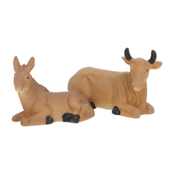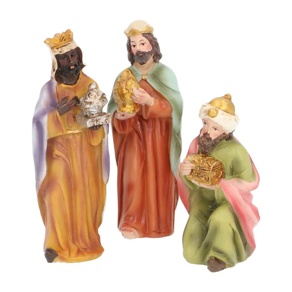 Colourful, painted nativity figures including baby Jesus, Mary and Joseph, the three wise men, a shepherd as well as an ox and donkey.