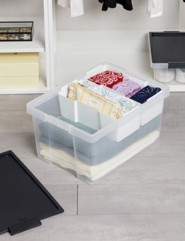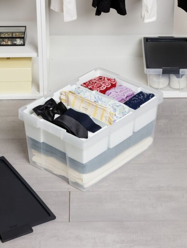 The Organizer tray for the 35L and 60L multipurpose storage boxes. The tray is ideal for taking your home organisation to another level. They attach to the upper part of the inside of the boxes and you can store smaller objects in them, to always have them in sight. They are made of highly resistant, durable and recyclable material. Ideal for solving a daily problem but with a modern and elegant design so that they can be integrated into every corner of your home.