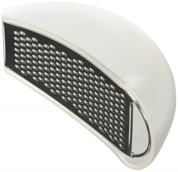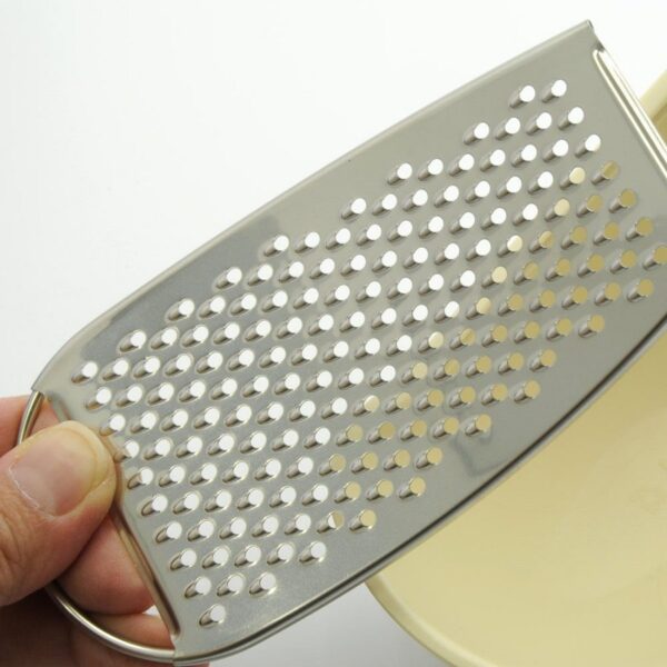 Parmenide, a cheese grater and cheese cellar in one item. The grater Parmenide designed by Alejandro Ruiz brings two aspects of the traditional household scene together, the cheese grater and the serving bowl. Parmenide also becomes an attractive piece of tableware once the cheese has been grated. Parmenide is in the collection of the Museum of Modern Art in New York.