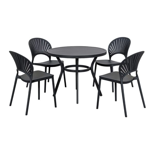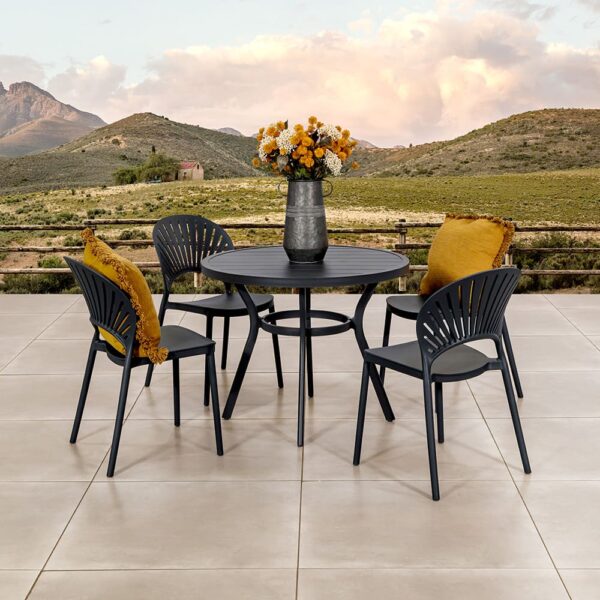 Settle in for a pleasant time with the robust charm of the Passeri 5-piece dining set. The table is made from lightweight, rustproof and low maintenance aluminium. It comes paired with the comfortable Passeri resin cut-out dining chairs that are durable and easy to clean. Offering a gorgeous fanned aesthetic with its open air chair back design, make it the perfect addition to any space in your home. The chairs are made from UV treated polypropylene for durability even when used outdoors as it is weather resistant with minimal maintenance.