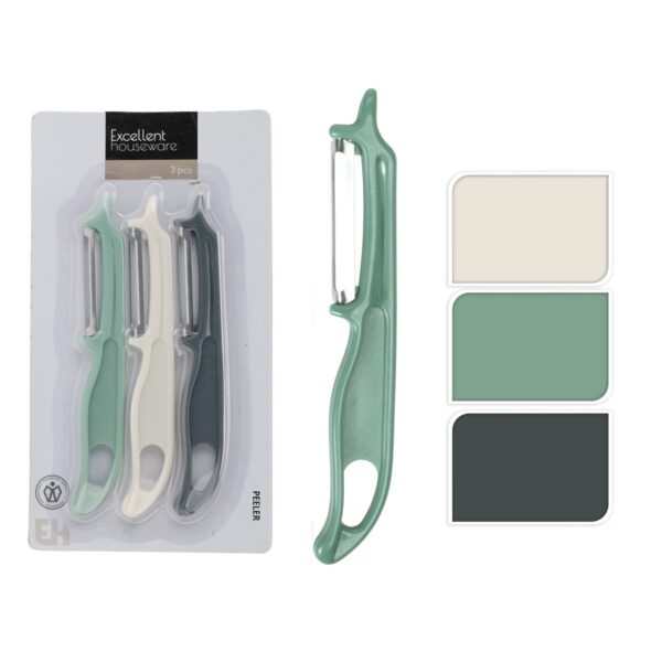 Set of 3 vegetable peelers made of high-quality plastic and stainless steel. The peeler has a double, rotating wide blade and comfortable handle which allows you to quickly prepare your favourite dishes. Necessary and practical in every kitchen. Suitable for washing in a dishwasher.