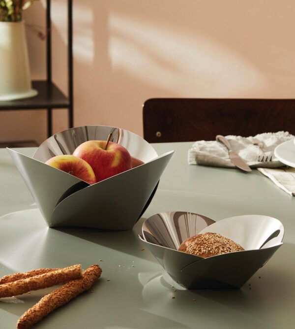 The “Pianissimo” basket joins the “Resonance” centrepiece and fruit holder and the “Harmonic” basket created by the same Australian designer. As in all her projects, Abi uses geometric artistic drawings as a basis to create three-dimensional sculptured objects, subjecting the sheet steel to successive cutting, folding and curving operations.