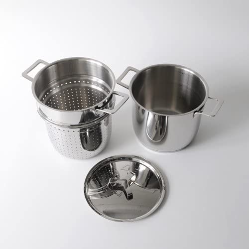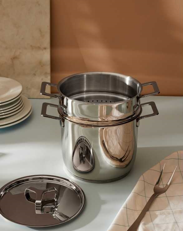The perforated basket of Pots&Pans collection is characterised, like the other objects that make up the series, by linear design, rigorous and careful attention to functional details, typical of Jasper Morrison. Innovative and distinctive, the shape of the handle ensures a firm and ergonomic grip at the same time. The pasta-set is the indispensable tool for pasta connoisseurs, allowing it to be cooked and drained using a single tool.