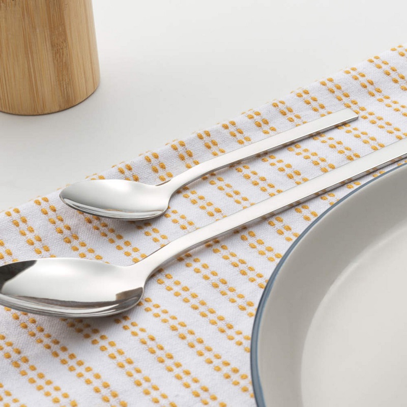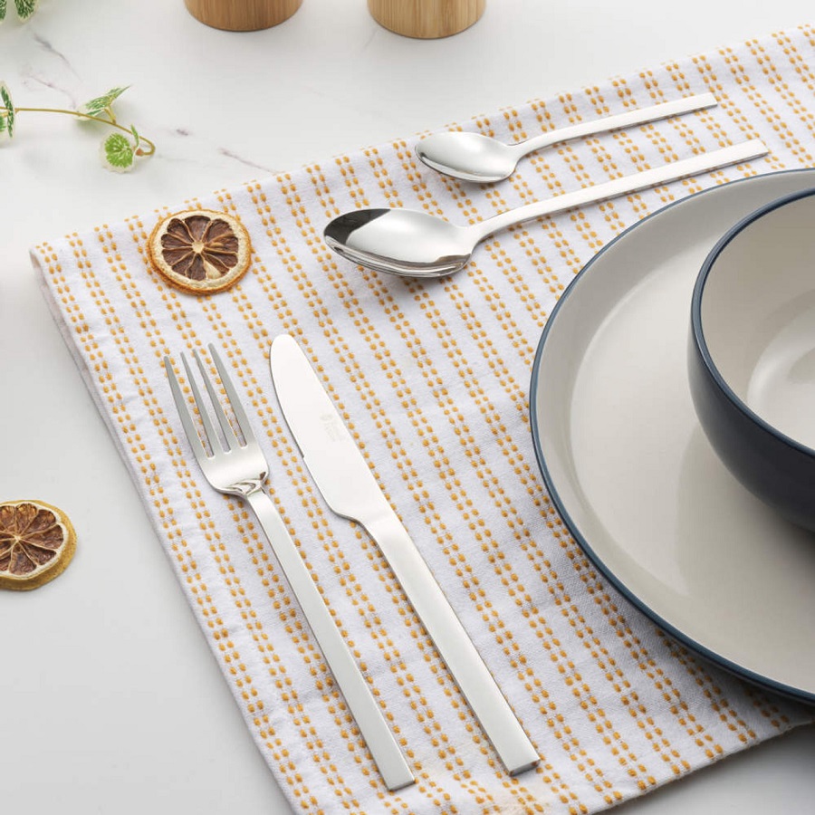 The Russell Hobbs Vermont 24-Piece Cutlery Set is designed to enhance your dining experience. This set is perfect for hosting dinner parties or everyday family meals with its service for 6 people. Crafted with a simple yet elegant design, it seamlessly complements any table setting. The classic mirror polished finish adds a touch of sophistication to every mealtime. Not only stylish but practical too, the set is dishwasher safe, making clean-up a breeze. Set consists of 6 table forks, 6 table knives, 6 table spoons and 6 dessert spoons.