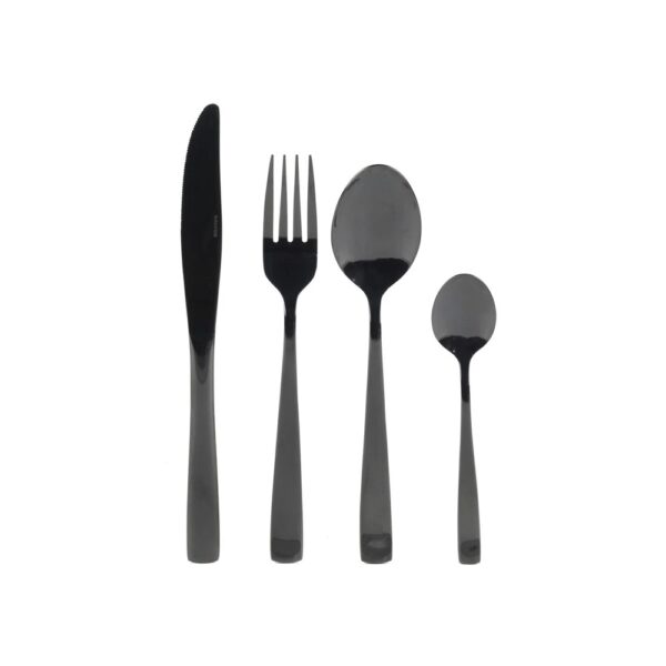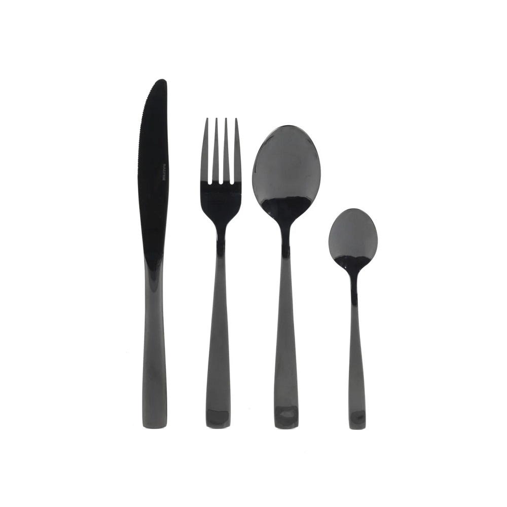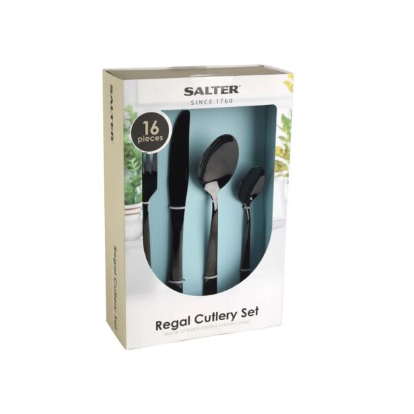 Dine in style with this exquisite black Salter cutlery, inspired by classic regal elegance with a unique modern twist. Ideal for creating a distinctive and original dining look, this 16 piece set contains 4 knives, 4 forks, 4 tablespoons and 4 teaspoons made from mirror polished stainless steel with a black coating which is guaranteed to impress your guests. Practical and durable, the set is perfect for everyday use while the gorgeous style will refresh and renew your existing tableware.