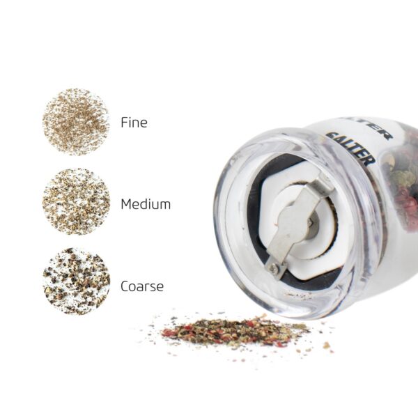 Whether it’s cooking a delectable meal or just adding final touches to your preparation, the classic and timeless design, paired with the unparalleled quality of Salter makes these contemporary mills a must-have, everyday cooking tool in any kitchen. Featuring a diamond hard ceramic for sharper and harder than steel grinding and an easy adjustable grind that allows you to set fineness from coarse to fine to meet your different needs in seconds, you’ll be able to distribute the right amount of salt and pepper with perfect accuracy. The crystal-clear acrylic is not only durable and easy to clean, but also shows when refilling is needed thereby making the Salter Contemporary Mills the perfect kitchen accessory for your household!